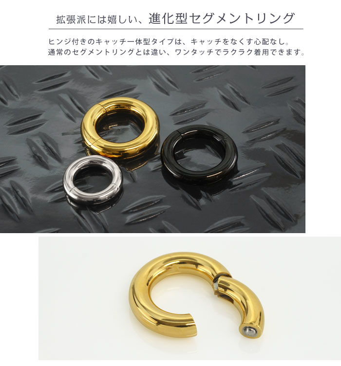 アイテムキーワード ボディピアス 6G 軟骨ピアス 軟骨 ピアス 軟骨用 セグメント リング セグメントリング リングピアス シンプル クリッカー セグメントクリッカー ヒンジ付 ワンタッチ ボディーピアス→20G | →18G/16G/14G →12G | →10G | →8G | →6G | →4G| →2G| →0G →16G/14G(24Kコーティング) ◆オススメポイント◆ 拡張派には嬉しい、進化型セグメントリング ヒンジ付きのキャッチ一体型タイプは、 キャッチをなくす心配なし。