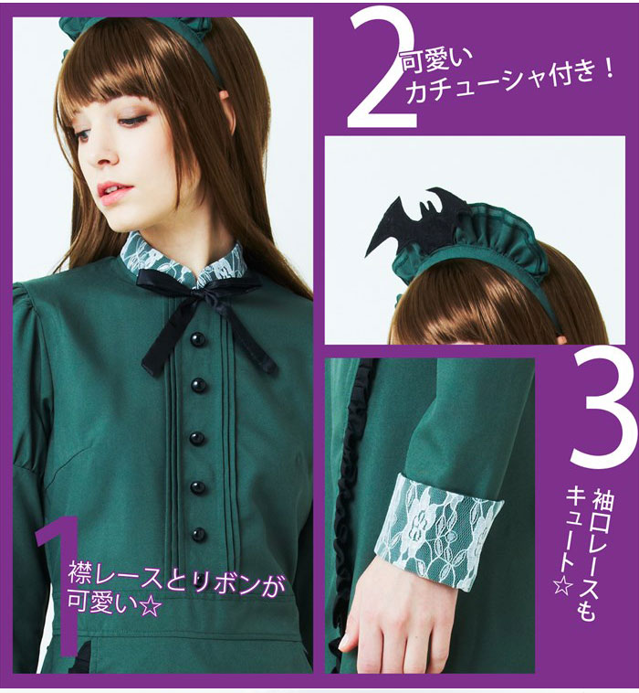 【セット内容】カチューシャ、ワンピース【素材】ポリエステル100%【洗濯表示】水洗い不可、塩素系漂白剤による漂白不可、アイロンは中温で当て布使用、石油系ドライクリーニング可【パッケージサイズ】OPP中袋(W230×H390mm) 【総重量(g)】435【対応サイズ】身長:155〜165cm、B:〜90cm、W:〜70cm、H:〜96cm【メイン部分の長さ(着丈等)(cm)】122【開き】背中心ファスナー【B(cm)実寸】92【W(cm)実寸】74【H(cm)実寸】-【肩幅(cm)実寸】38【袖丈(cm)実寸】60【股下(cm)実寸】-【裏地の有無】無し【送料について】北海道、沖縄、離島は別途送料を頂きます。